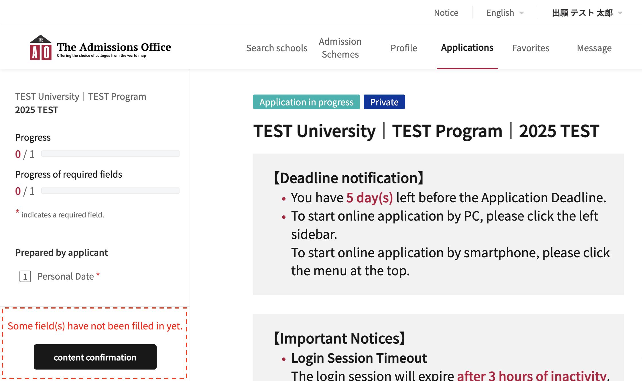 -About the Application Progress and Progress of required fields (upper left sidebar of the screen) indicate the progress of your documents. "Progress" shows the progress of all documents, and "Progress of required fields" shows the progress of documents that are required to be submitted. When all required fields have been completed, you will be able to click on "content confirmation."-Documents to be submitted (middle to bottom of the sidebar on the left side of the screen) You will see all the documents that the university is requesting you to submit. You can enter them in any order. *Not all of the following types of documents may be required. -Prepared by applicant Documents to be entered by the applicant. -Prepared by person other than applicant Documents that the applicant needs to request a third party to fill out. -Postal documents Documents that the applicant prepares on his/her own and sends to the address specified by the university.
