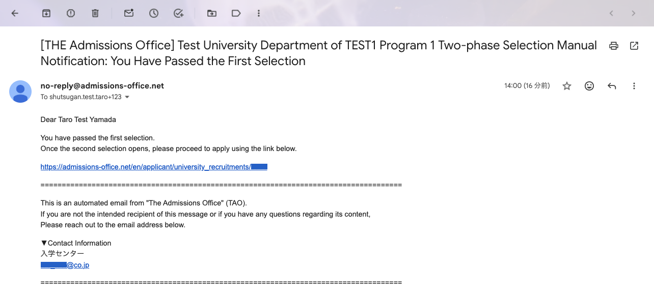 After the announcement date, an email titled [Notification: You Have Passed the First Selection] containing a link to the 2nd selection will be sent. By clicking the link, you can navigate to the admission scheme details page for the 2nd selection. This email will also be sent to unsuccessful applicants (both 1st and 2nd selection).