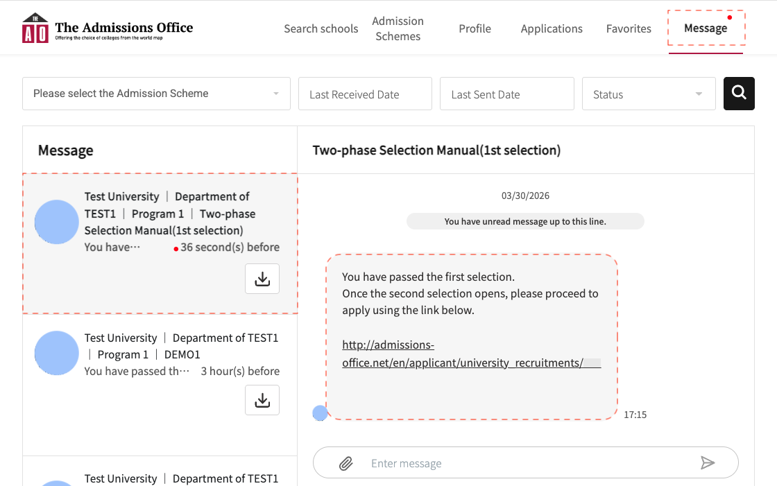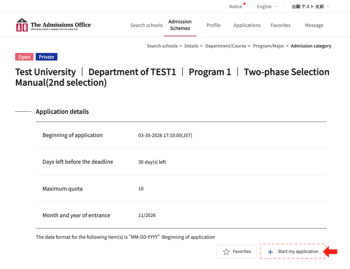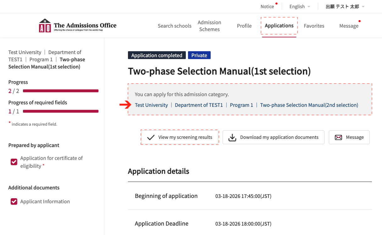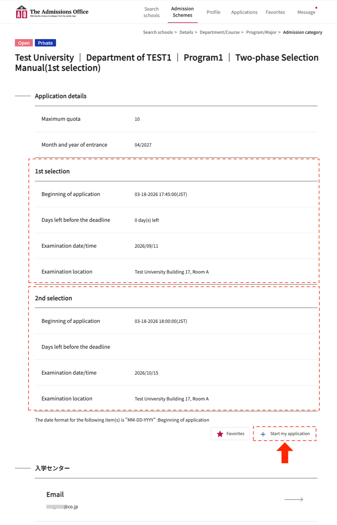 After the announcement date, a notification containing a link to the 2nd selection will be sent. By clicking the link, you can navigate to the admission scheme details page for the 2nd selection.