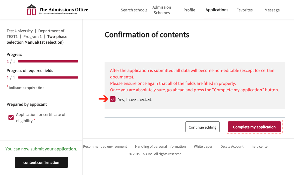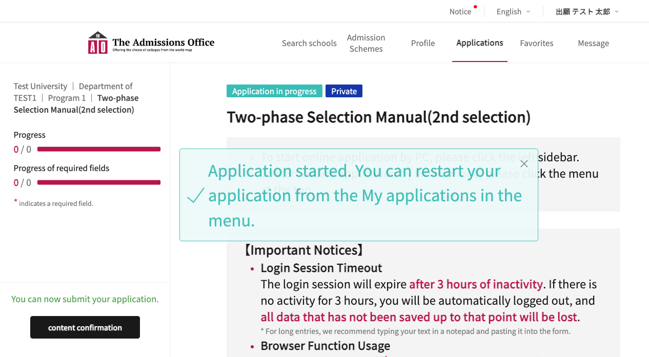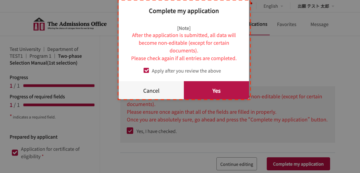 ・Your application will be completed once you accept the confirmation modal regarding application completion.